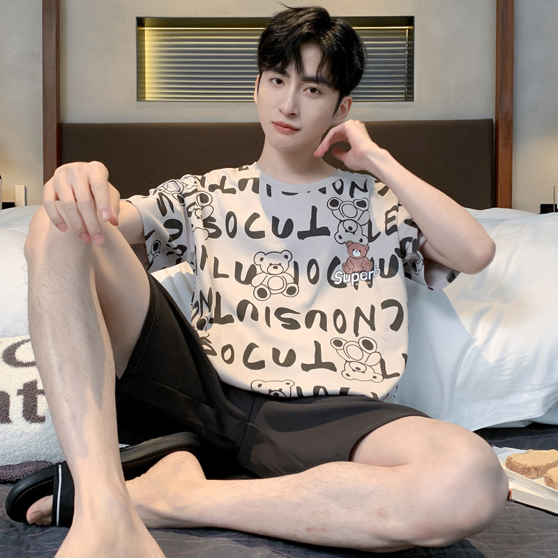 純綿男性パジャマ夏の新型丸首漫画学生の薄い金は綿半袖半ズボンの部屋服を着ることができる