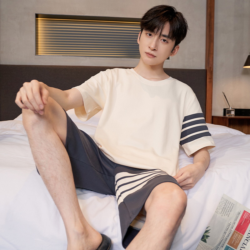 夏の純綿パジャマ男性丸首大サイズカジュアルは、新しい男性半袖半ズボンの家庭服セットを着ることができる