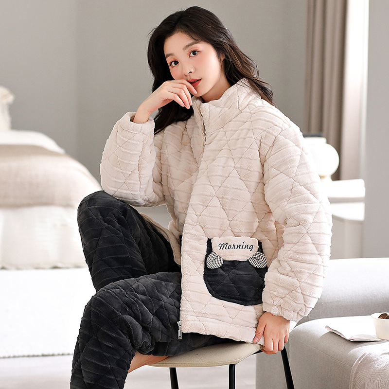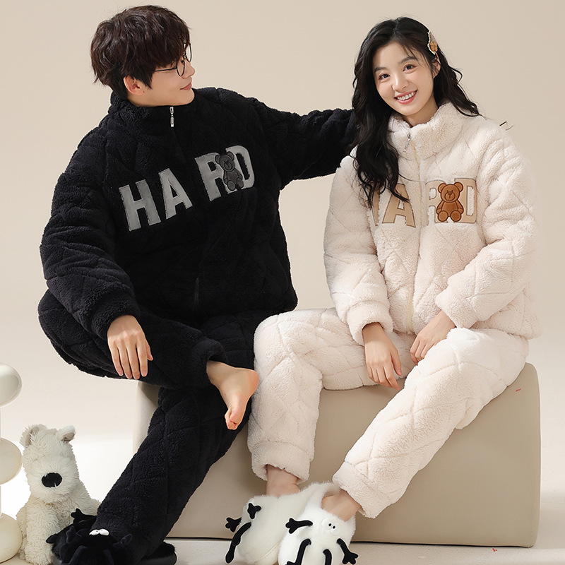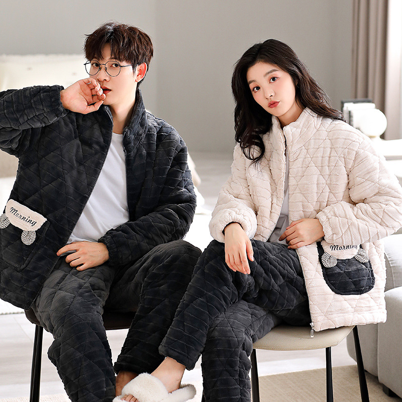 カップルのパジャマ女性の冬の新しいジッパーのスタンドカラーは、3層の綿とベルベットを着て保温家の服の男性を厚くすることができます