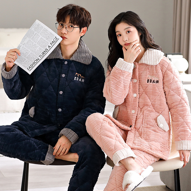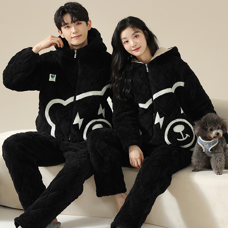 帽子付きカップルパジャマ冬の新型三層綿とベルベットが厚くて保温性があり、帽子付きの家庭服セットを着ることができる