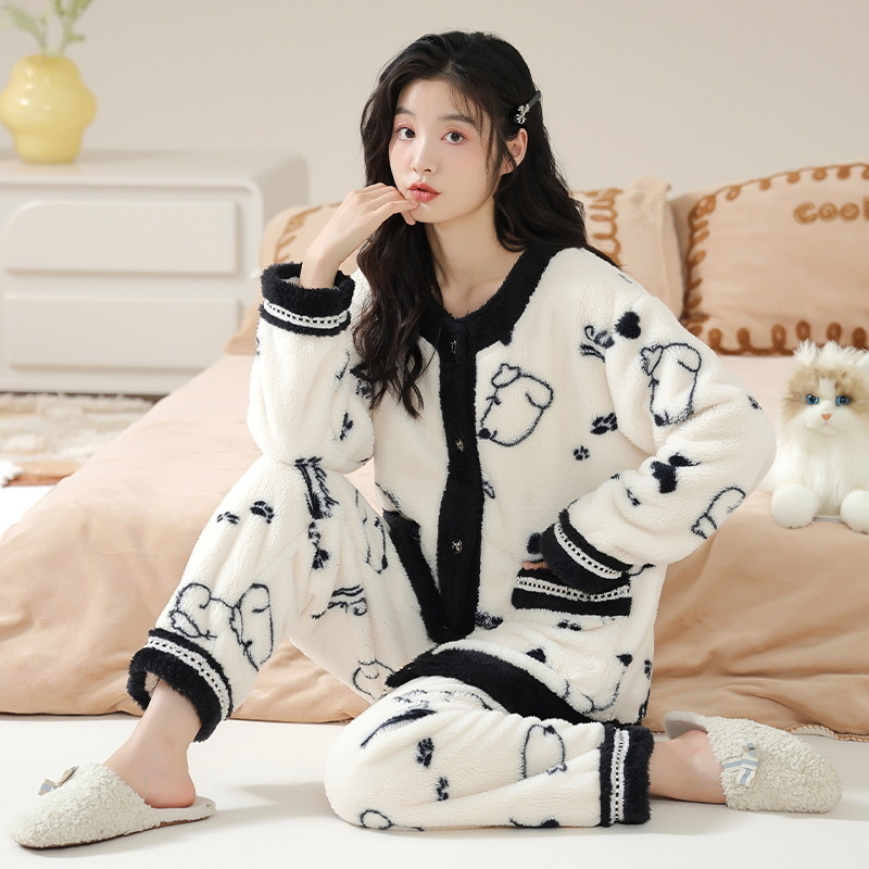 徳絨毛パジャマ女性秋冬丸襟少女学生は、蓄熱パイル保温冬長袖ホームウェアを着ることができる