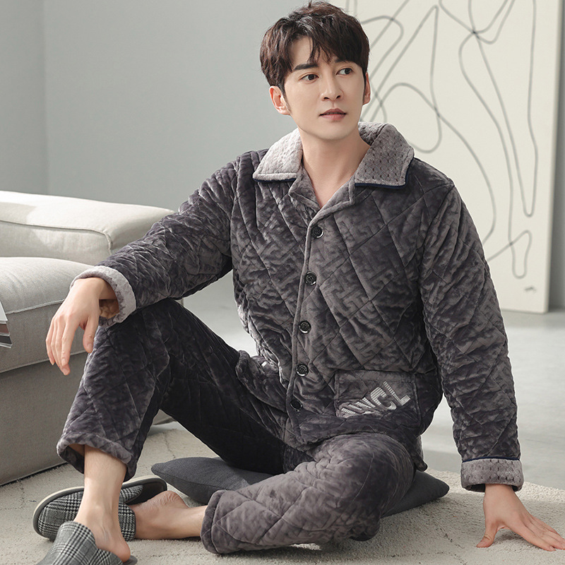 三層綿入りパジャマ男性冬の新しい襟の大きいサイズの中年のお父さんはフランネルの綿入り家庭服を着ることができる