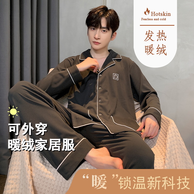 徳絨毛男性パジャマ冬の新しい襟付きカーディガンの純色は暖かいベルベットの保温家庭服男性スーツを着ることができる