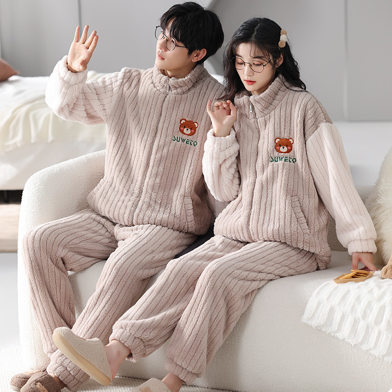 フランネルパジャマ女性の冬の新しいスタンドカラーのカーディガンのジッパーの大きいサイズは、暖かいベルベットのカップルのパジャマを着ることができます