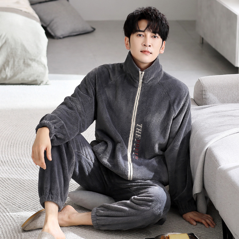 冬フランネルパジャマ男性スタンドカラージッパー軽いスポーツ風外着コーラル男性ホームウェアセット厚手