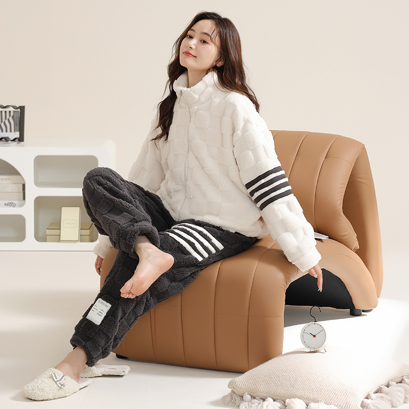 フランネルパジャマ女性の冬の新しいスタンドカラーの軽いスポーツ風のカジュアルな大きいサイズは、サンゴのベルベットのカップルのパジャマを着ることができます