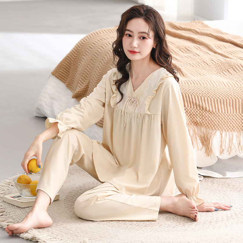 長袖の純綿のパジャマの女性の秋の新型の丸いネクタイの胸のマットは全綿の家庭服の長袖の女性のスーツを着ることができます。