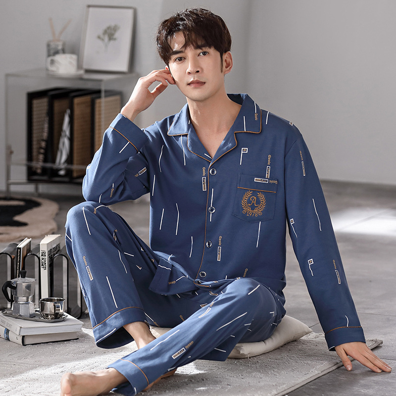 純綿パジャマ男性秋の長袖の襟付きカーディガンの大きいサイズは綿の男性の部屋服の2つのセットを着ることができます。