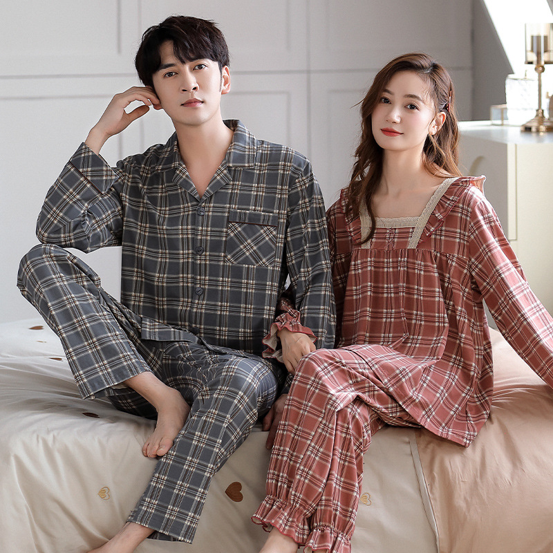 カップルのパジャマの女性の棚のさわやかな綿の秋冬の新型の格子の大きいサイズは純綿の家庭服の男性のスーツを着ることができます。