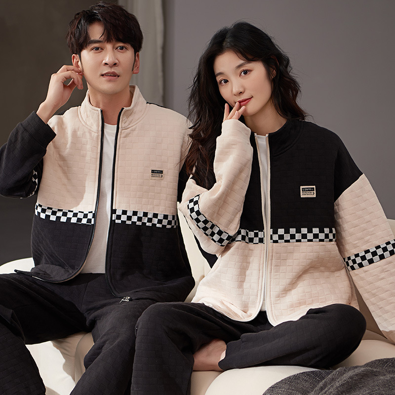 冬のカップルパジャマ純綿長袖セット襟折りカーディガン三層サンドイッチ厚タイプ保温可ホームウェア