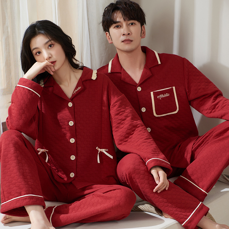 冬の結婚カップルのパジャマの女性綿の赤い本命年の長袖の3層のサンドイッチの厚いタイプは家の服を着ることができます。