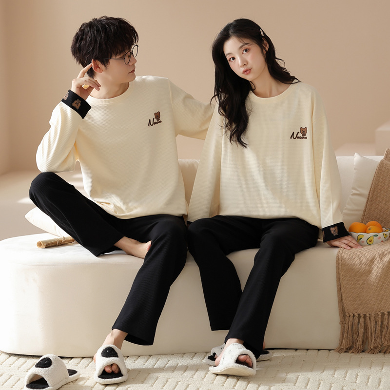 ワッフルカップルのパジャマ丸首カジュアル男性長袖セットアニメ熊は純綿パジャマ女を着ることができる