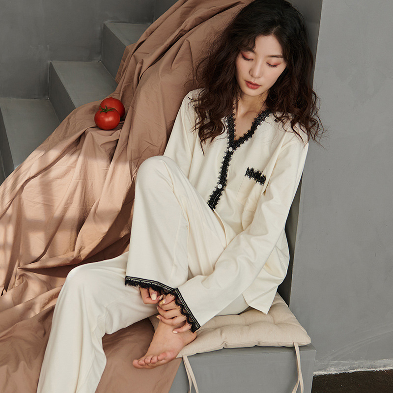 長袖の純綿のパジャマの女性の秋の新型の純色の小さい香風のカーディガンは外に棚の綿の家庭服のスーツの女性を着ることができます。