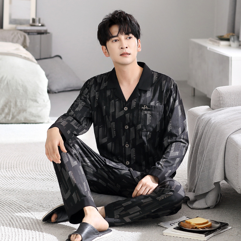 秋の新商品の襟をひっくり返して綿の長袖の家庭服の秋冬の中年の男性の大きいサイズは純綿のパジャマの厚い服を着ることができます。