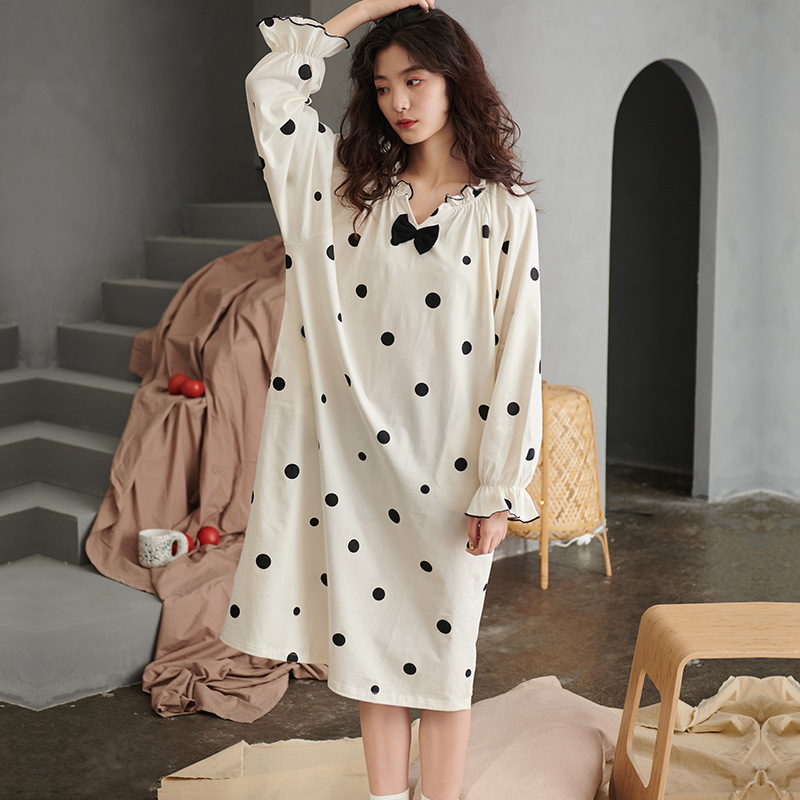 秋の新しい綿のパジャマの女性の波点の少女のゆったりした大きいサイズの妊婦のスカートのファスナーの綿の長袖のワンピースの眠るスカートの女性