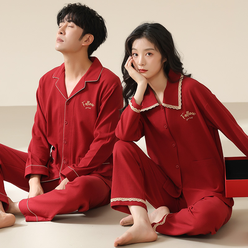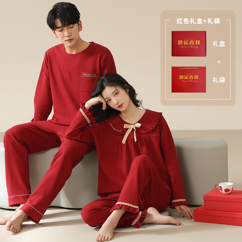 カップルパジャマ女性秋結婚新婚赤本命年純綿ワッフル秋冬長袖ホームウェアセット