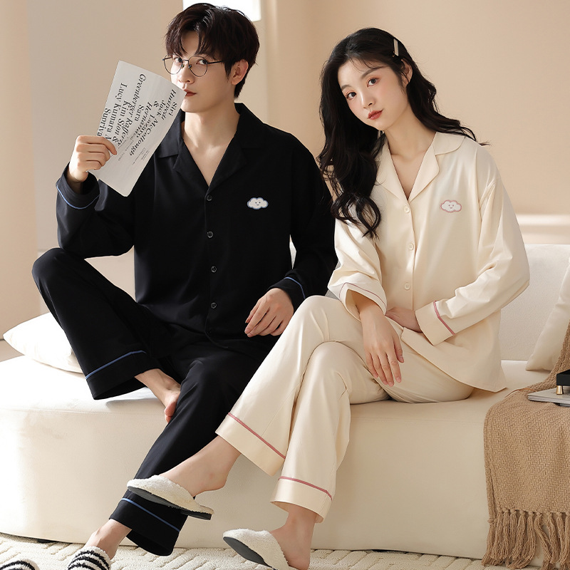 新しいプルオーバー綿カップルパジャマ男性純色ins北欧風家庭服長袖は純綿パジャマ女性を着ることができる