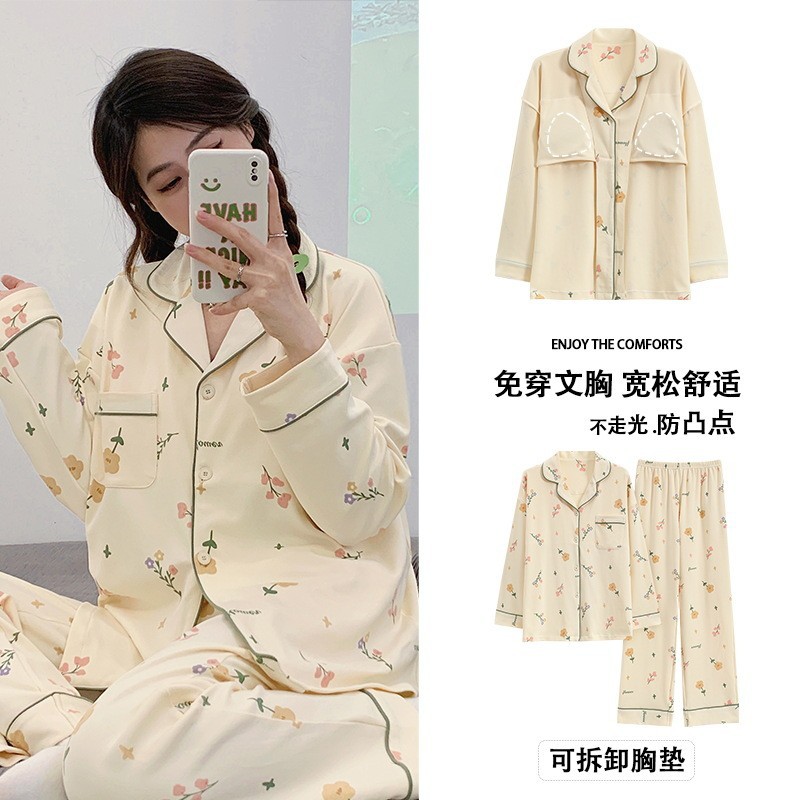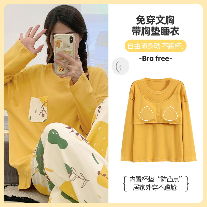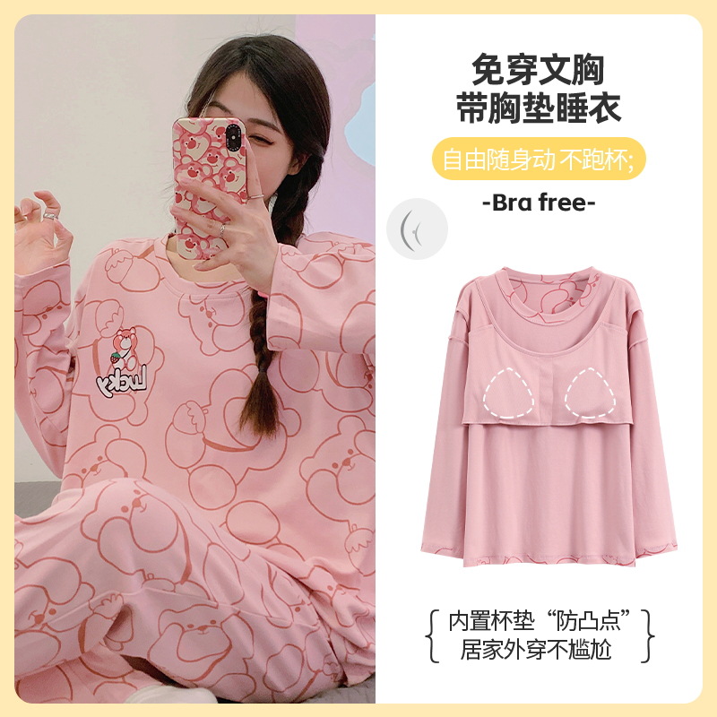 純綿パジャマ女性秋の新型可愛い少女は胸パッドを持って綿の長袖の部屋服を着ることができます。