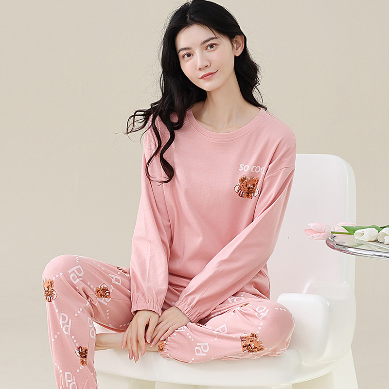 純綿のパジャマの女性の秋の新型の丸首の少女の学生の綿は長袖の部屋の服の女性のスーツの厚い服を着ることができます。