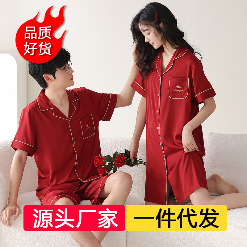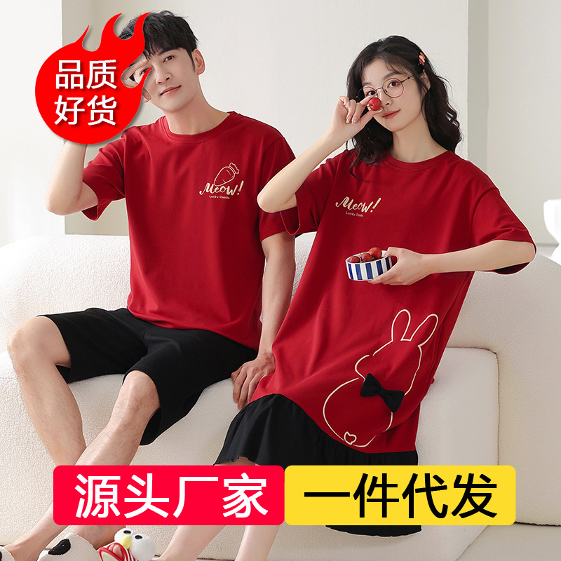 夏のカップルのパジャマの女性純綿新婚結婚の赤いスーツは本命年の純綿半袖の家庭服の男を襟ます。