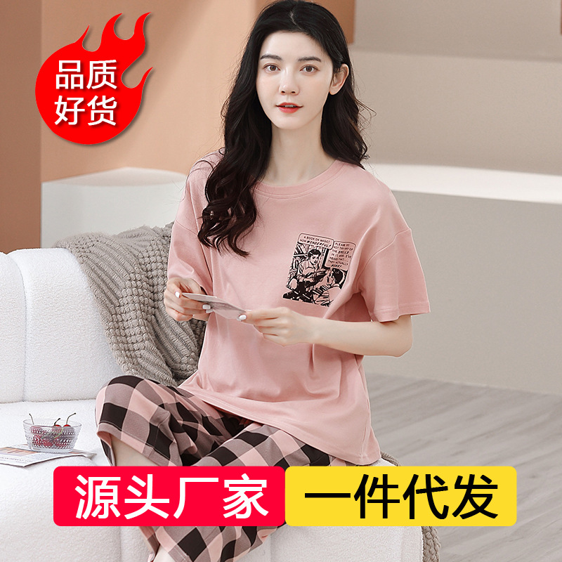 夏の純綿パジャマ女性半袖七分ズボン二点セット中年のお母さんは家庭服を着て生放送します。