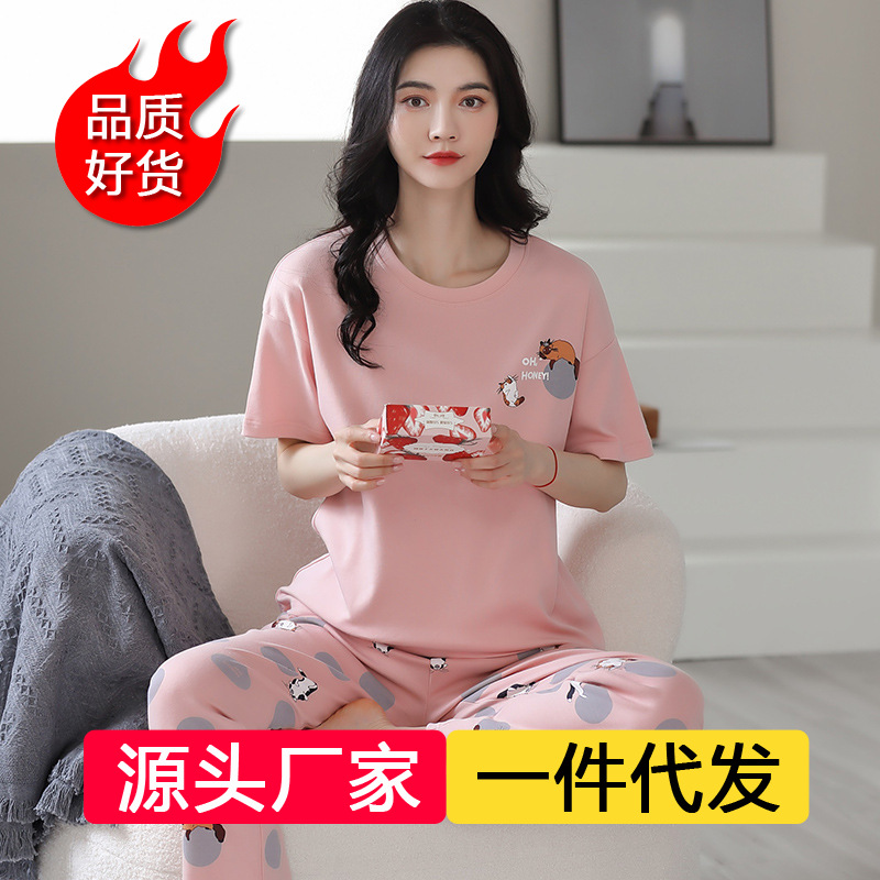 純綿パジャマ女性夏新作カジュアル大きいサイズ丸首薄い半袖長ズボン純綿ルームウェア2点セット