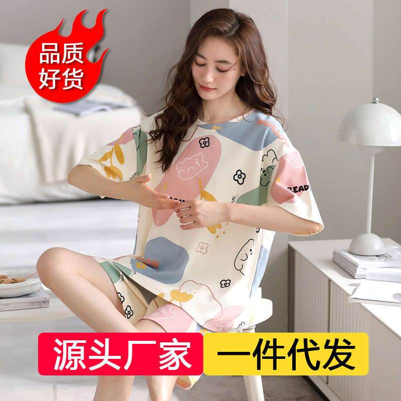 純綿パジャマ女性夏新作アニメ少女半袖半ズボンセットカジュアル丸首大きいサイズ男性ホームウェア