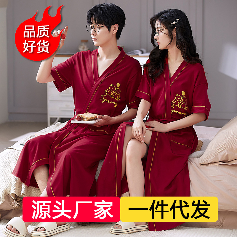 カップルのバスローブの夏の薄い綿のパジャマの半袖の家の服の男性のホテルの風の結婚の大きい赤いパジャマの女性