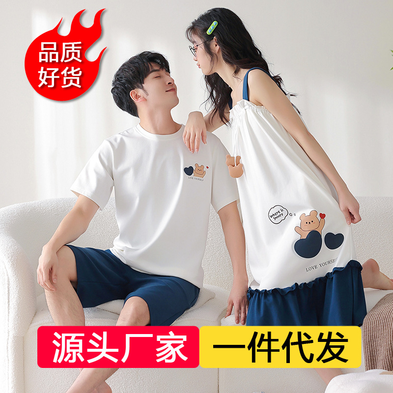 カップル純綿パジャマ男性丸首ゆるい子供服少女サスペンダースカート女性パジャマホーム服ワンピース夏