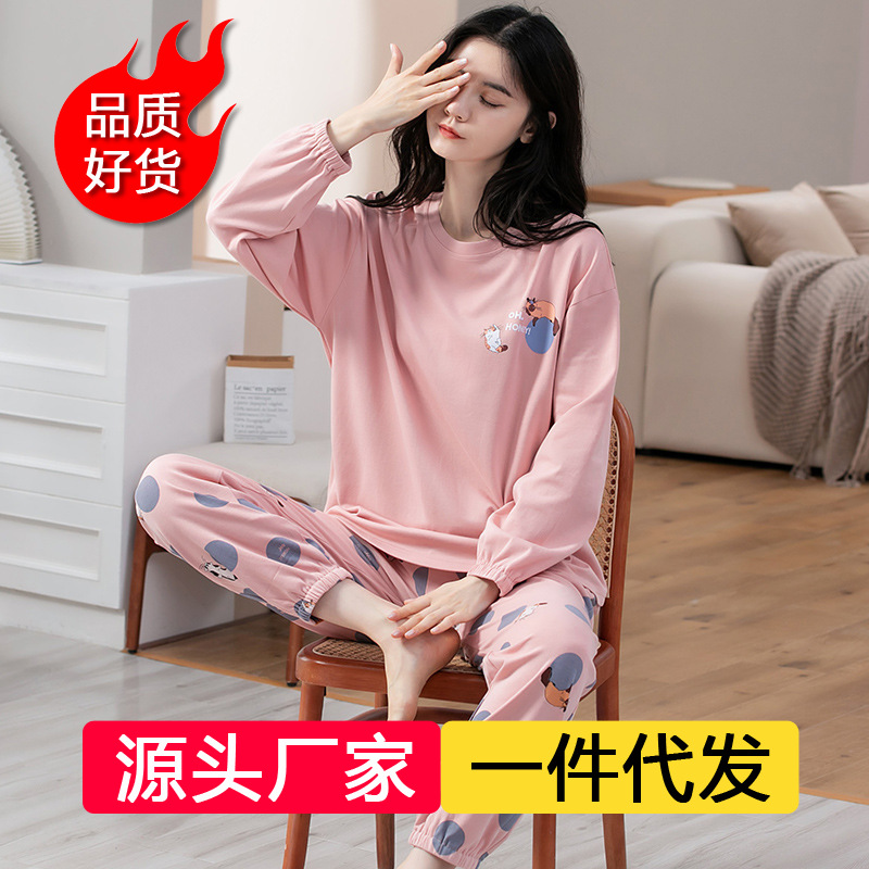 春と秋の純綿パジャマ女性秋冬の中厚長袖の甘い少女の綿の丸首は家庭服のスーツを着ることができます。