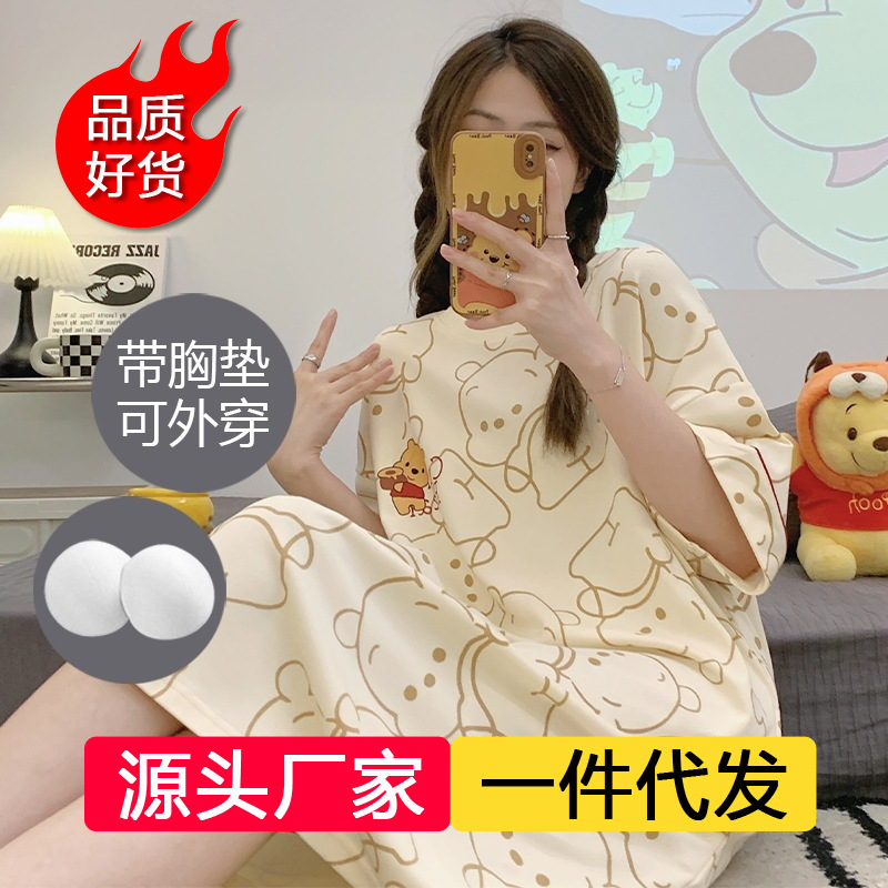 夏の純綿のパジャマの女性アニメの少女は胸のパッドを持って綿の半袖のパジャマの中の長いワンピースのスカートを着ることができます。