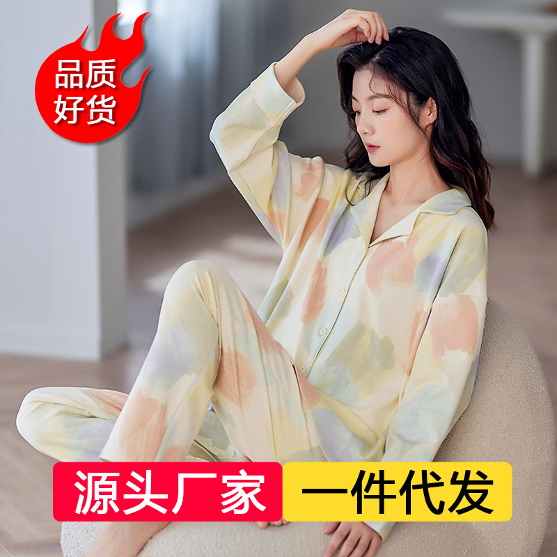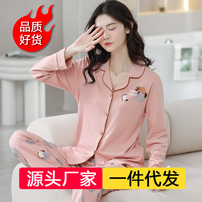 パジャマ女性秋冬の厚手の純綿の襟がゆったりしています。