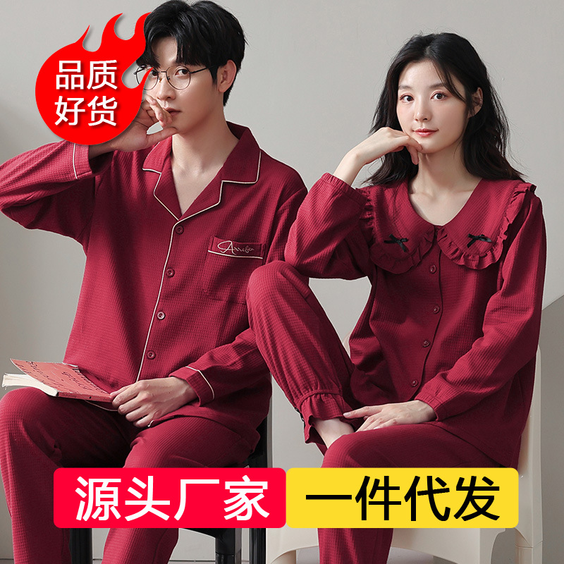 【結婚シリーズ】秋冬カップルパジャマ男純綿ワッフル長袖大紅本命年新年パジャマ女