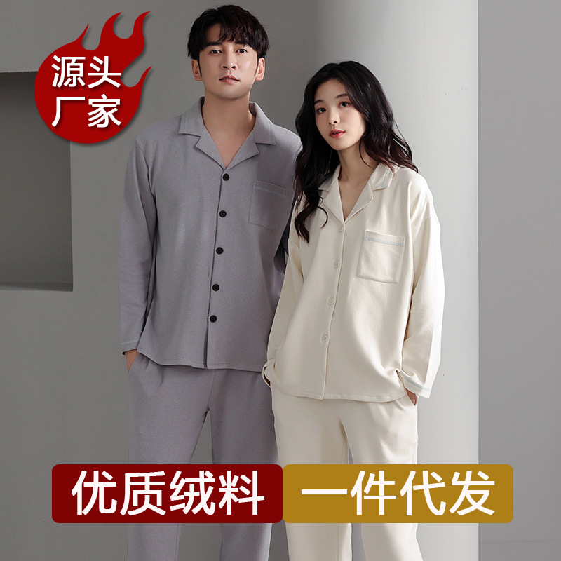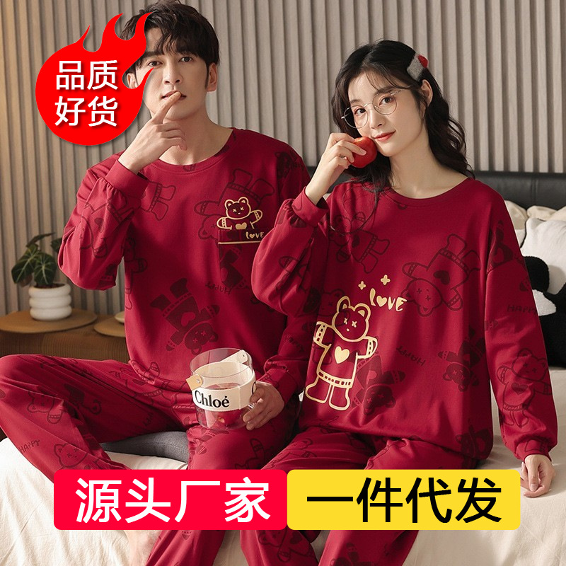 純綿カップルパジャマ女性秋冬新作丸首家庭服セット大紅本命年結婚秋冬パジャマ男