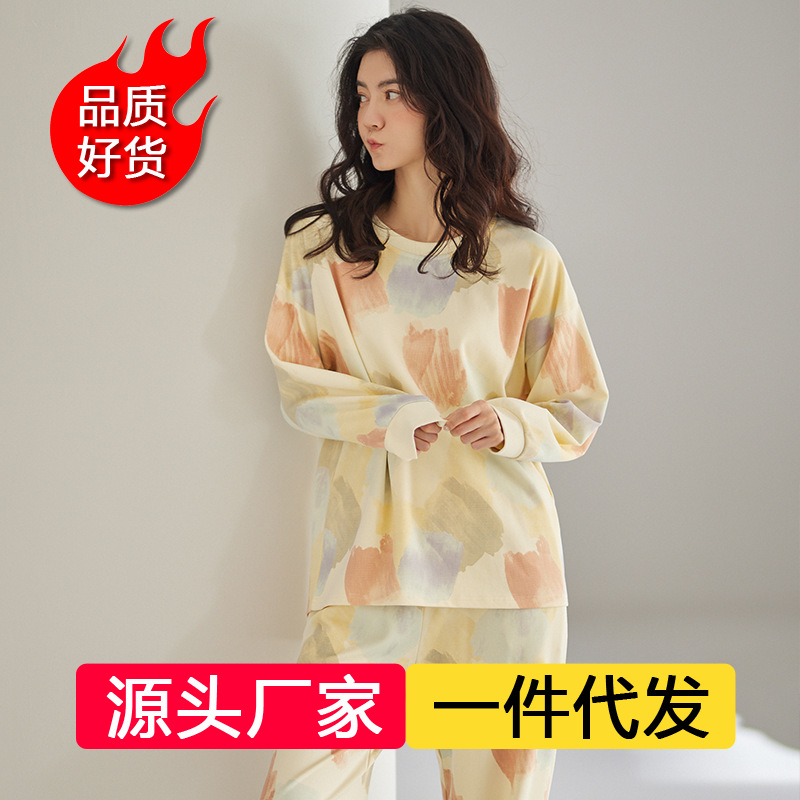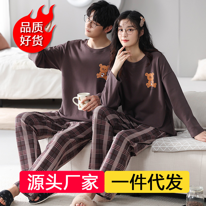 2022秋の新しいカップルのパジャマの女性の丸首の頭の長袖のカジュアルな少女の純綿の秋冬の部屋の服の男