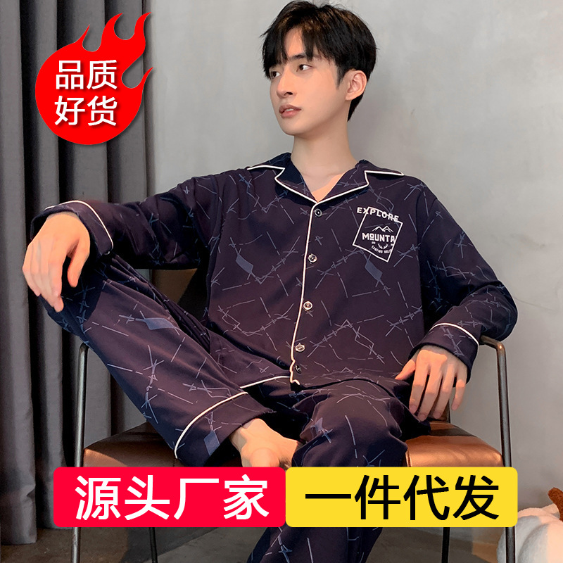 パジャマ男性秋冬純綿新型長袖長ズボンセットの襟がゆったりしています。