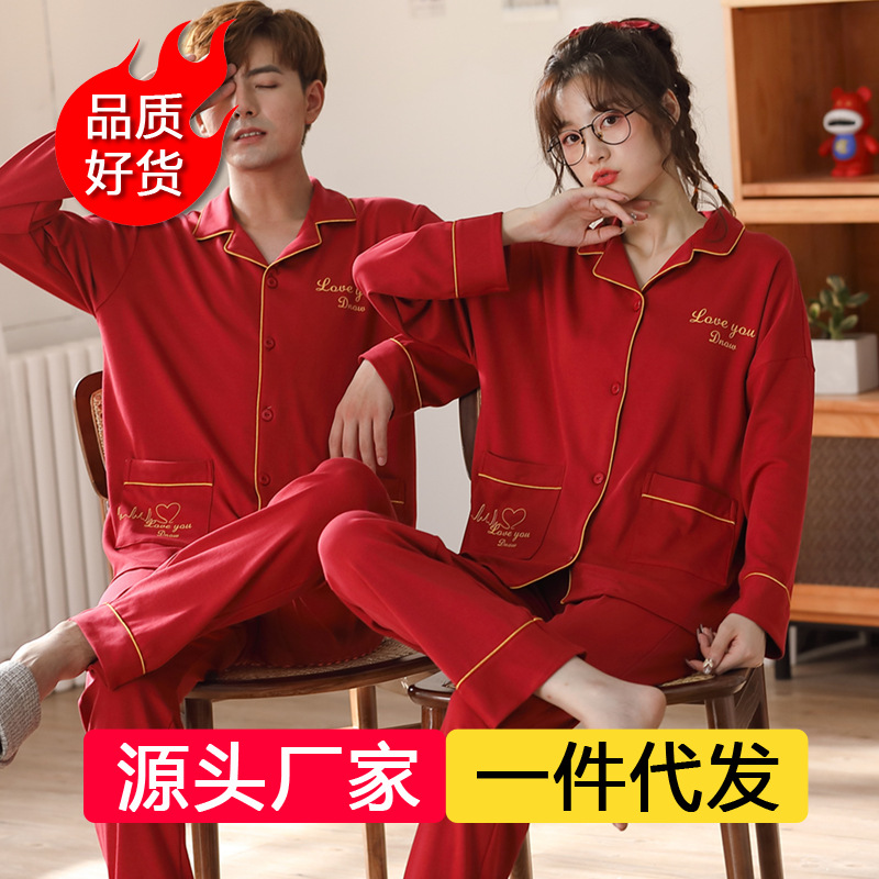 純綿カップルパジャマ男大紅本命年結婚新婚家庭服女秋冬長袖二点セット