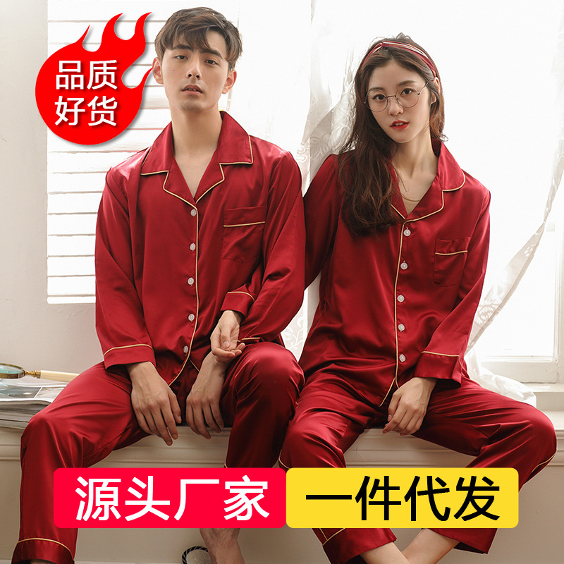 秋の新作アイスパジャマ女性結婚大紅本命年長袖カップルスーツ