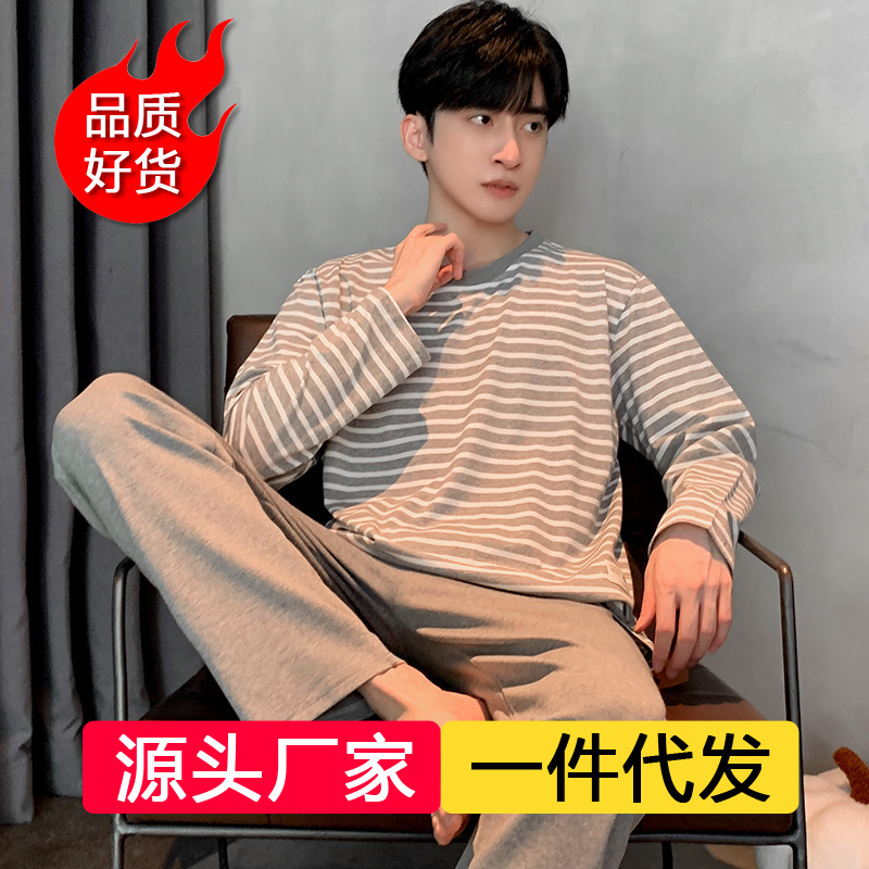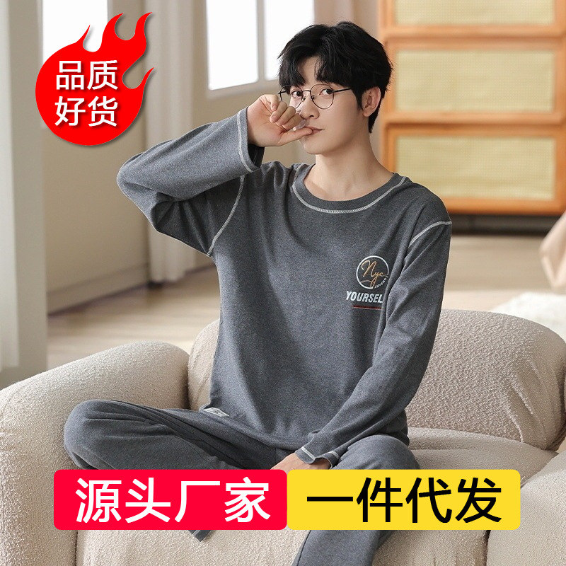 春秋の新型純綿パジャマ男性カジュアル丸首は綿100% 秋冬男性家庭服セットを着ることができます。