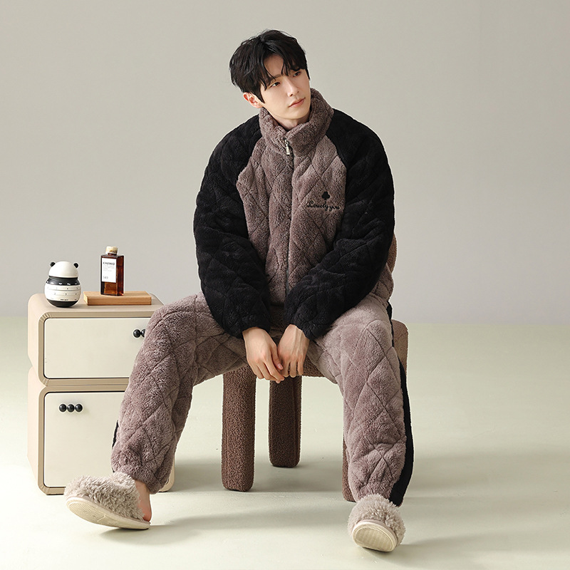 新しいサンゴのベルベットのパジャマ男性の3層の襟のジッパーの綿のベルベットの厚い保温家庭服セット