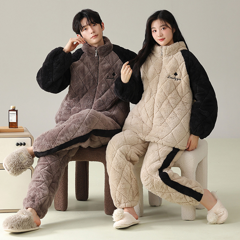 新しいカップルのサンゴの毛の綿のパジャマの女性の3層の立襟のファスナーは綿とベルベットを挟んで厚い保温の部屋の服の男性を包みます。