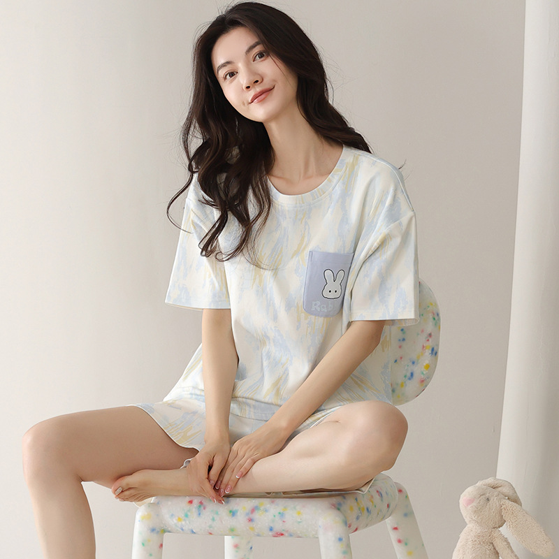 パジャマ女性の夏の純綿半袖半ズボンの家の服の夏の純綿の漫画の少女の大きいサイズの薄いタイプのスーツ
