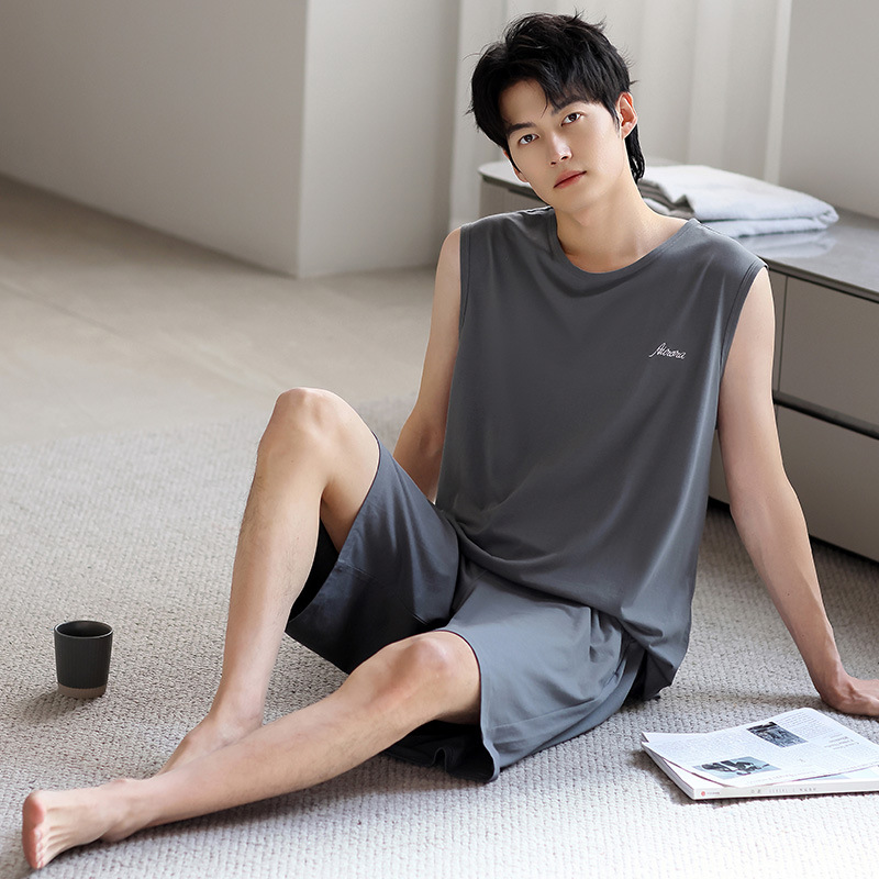 新しいモーダルパジャマメンズ夏メンズクールノースリーブベストショーツ夏薄いホームウェアセット