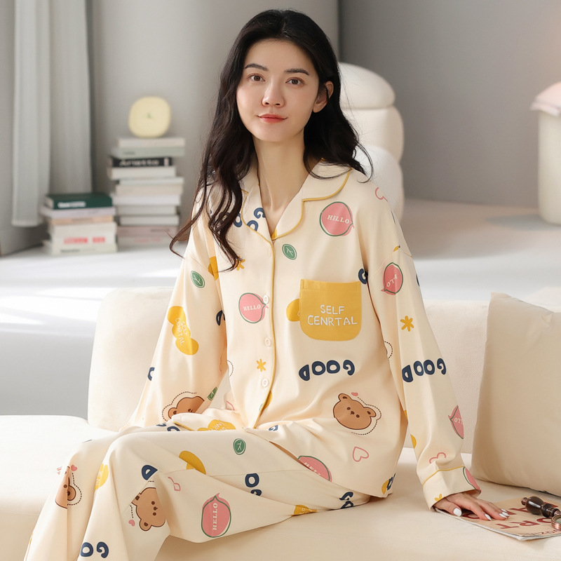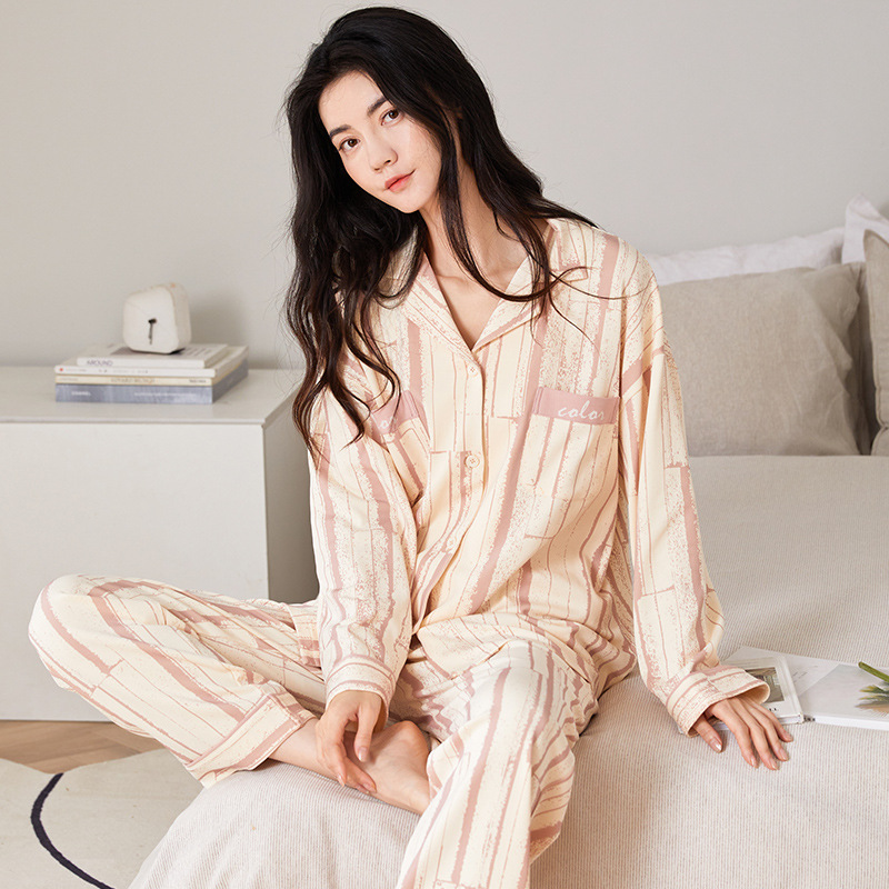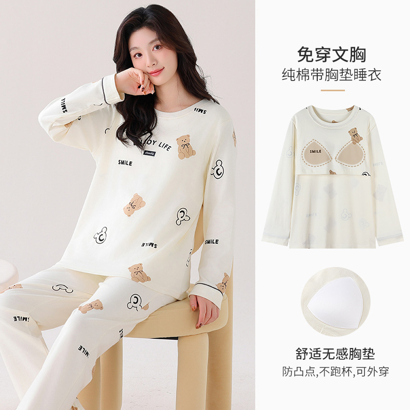 胸パッド付きパジャマ女性の春と秋の純綿の長袖カバーは、女性の大きいサイズの純綿の家庭服セットを着ることができます。