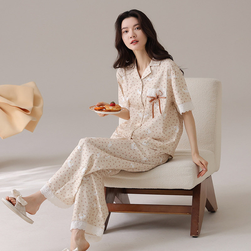 ラックを引っ張ってさわやかな綿のパジャマの女性のタイプの夏の新型の半袖のズボンの花の少女の襟のカーディガンの純綿の家の服