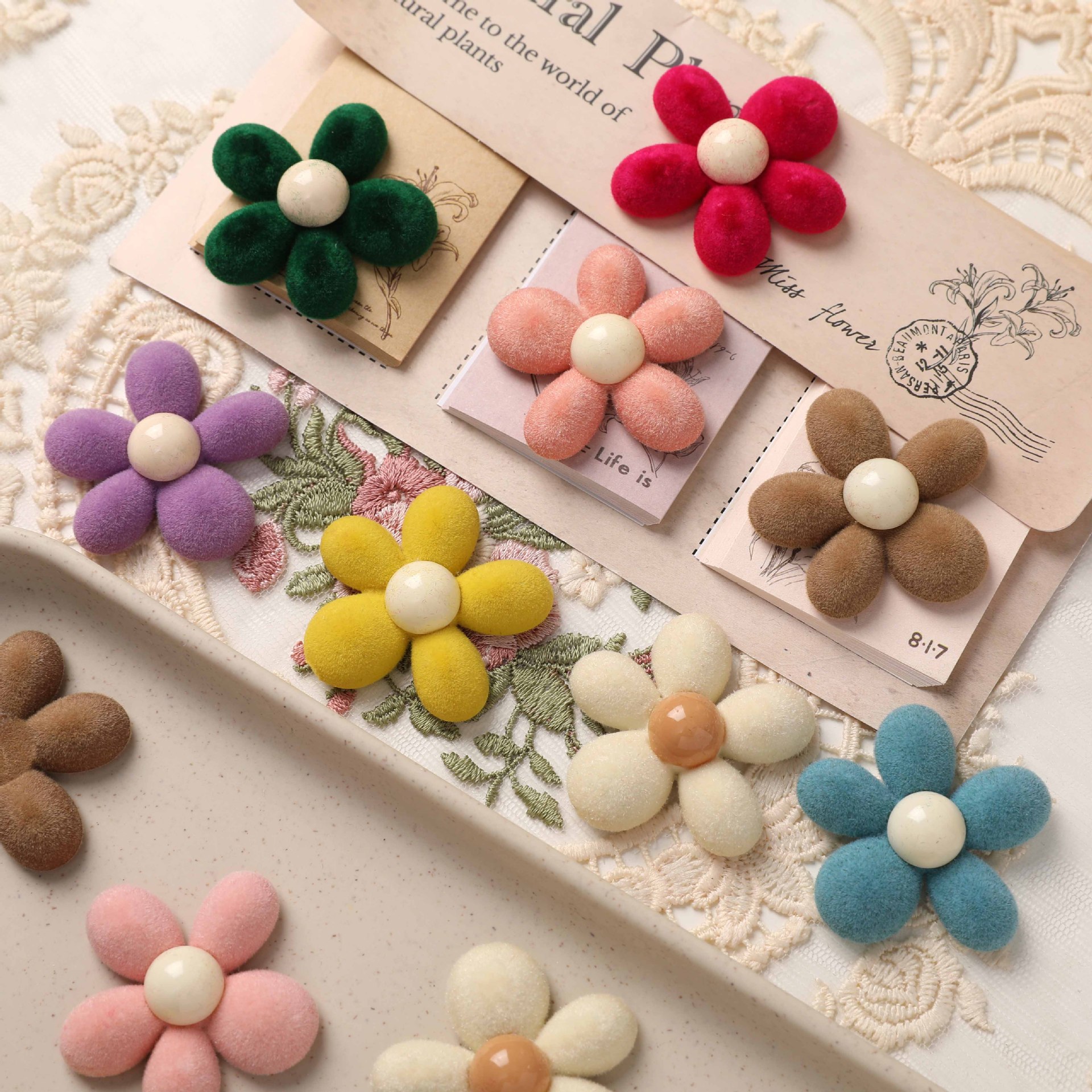 田園風多色かわいいカラー植毛アクリル花diy髪飾り髪紐材料卸売り