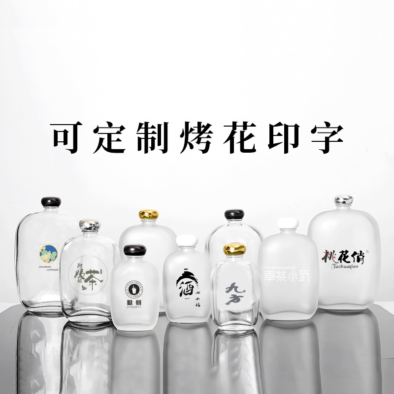 卸売り創意ガラスの小さい酒の瓶は透明な果実と酒の白酒を密封して瓶のガラス瓶の空の瓶を分けて花の印字を焼くことができます。