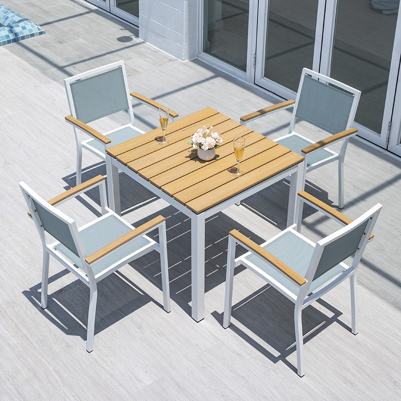 屋外庭園露天防水日焼け止めテーブルと椅子の組み合わせアルミ合金模造木目テーブルと椅子セットレジャー屋外家具