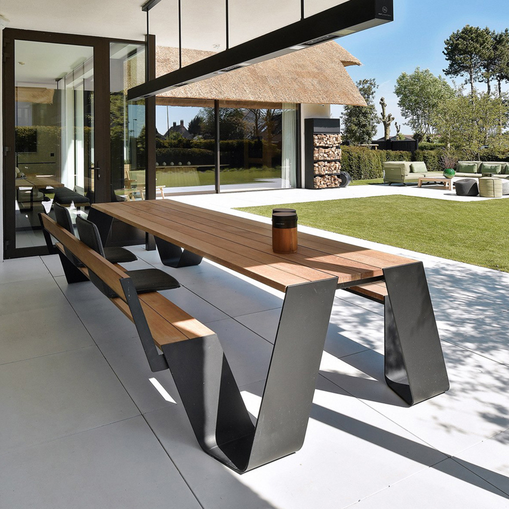 屋外のテーブルと椅子のセットの連体のベンチの庭のレストランの喫茶店のレジャーの露天の庭のステンレスの外は組み合わせを並べます。