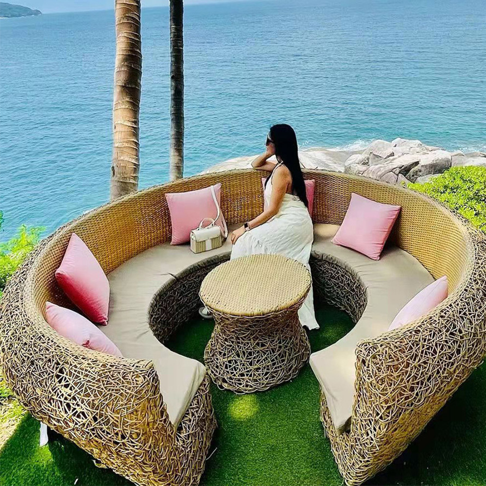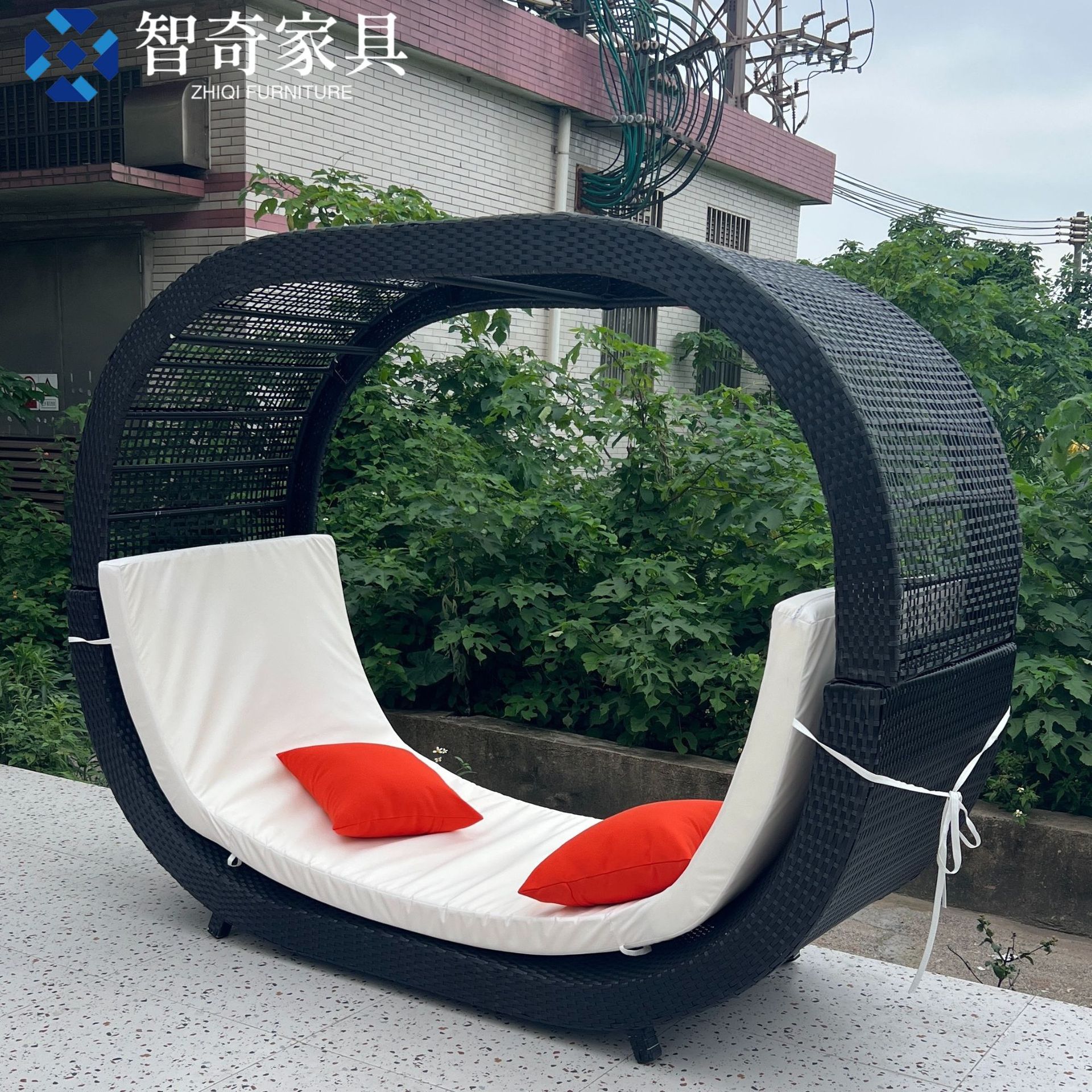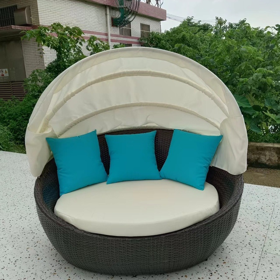 屋外用リクライニングベッド、プール、昼寝、天蓋付き、籐製丸型ベッド、屋外ヴィラ、ホテル、リゾート、防雨、防酸化、屋外設置